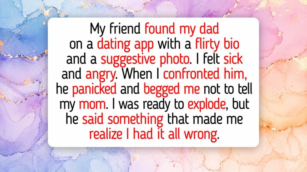 My friend found my dad on a dating app with a flirty bio and a suggestive photo. I felt sick and angry. When I confronted him, he panicked and begged me not to tell my mom. I was ready to explode, but he said something that made me realize I had it all wrong. Then he told me to read his messages. Every single convo was him immediately saying he’s happily married and explaining he made the profile to learn how dating scams work because I got catfished twice and lost money. He’d been asking women for red flags, collecting advice, screenshots, patterns, basically building a guide to keep me safe. I just started crying. He said he couldn’t undo what happened, but he could try to protect me next time. We told my mom together. She just laughed, hugged him, and called him ridiculous. Sometimes parents do things that look awful until you realize they’re just trying to look out for you.